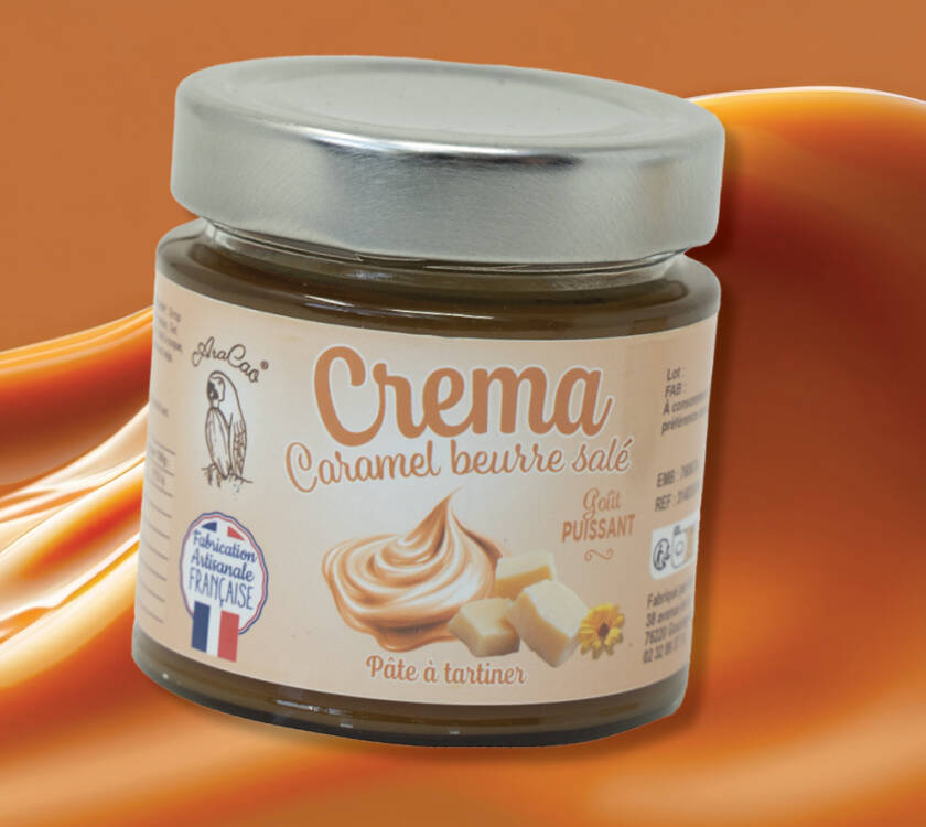 Sucre caramélisé, beurre et pointe de sel : une crème généreuse à la texture nappante. En bouche : toffee fondant, éclat salin mesuré et rondeur beurrée. À étaler sur crêpes ou à sublimer en cœur coulant. ARACAO : signature artisanale et maîtrise du geste pour un caramel salé intensément gourmand.