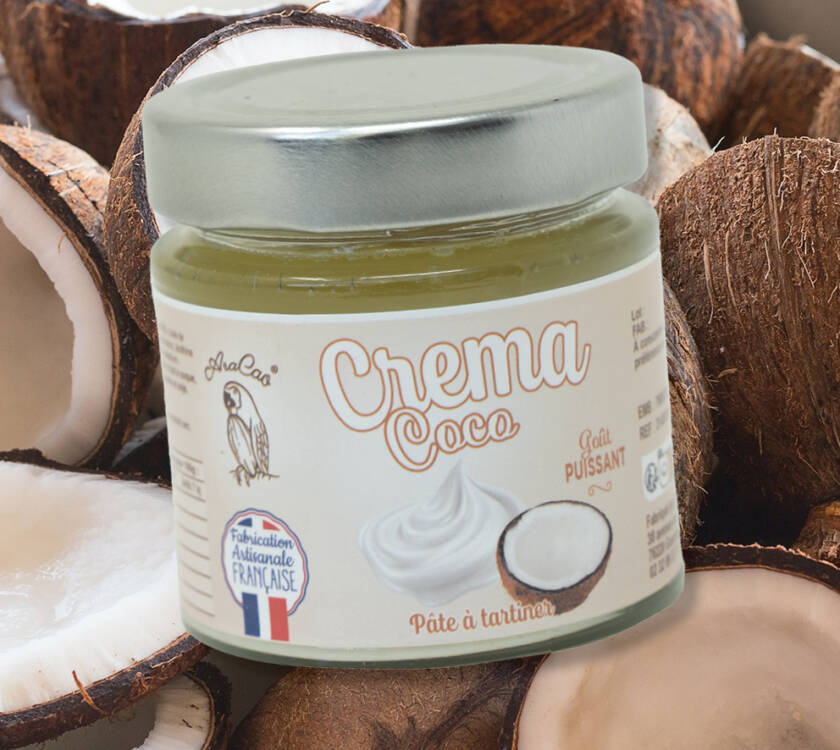 Pulpe de coco sélectionnée : émulsion onctueuse et texture aérienne. En bouche : fraîcheur lactée, accents exotiques et pointe de cannelle. À étaler sur brioche ou à twister avec ananas, parfaite en rochers coco, panna cotta ou entremets. ARACAO : ingrédients sélectionnés, goût coco net et plaisir solaire.