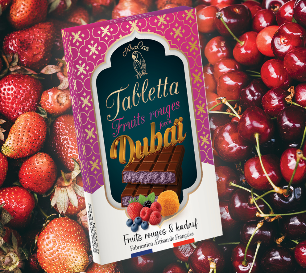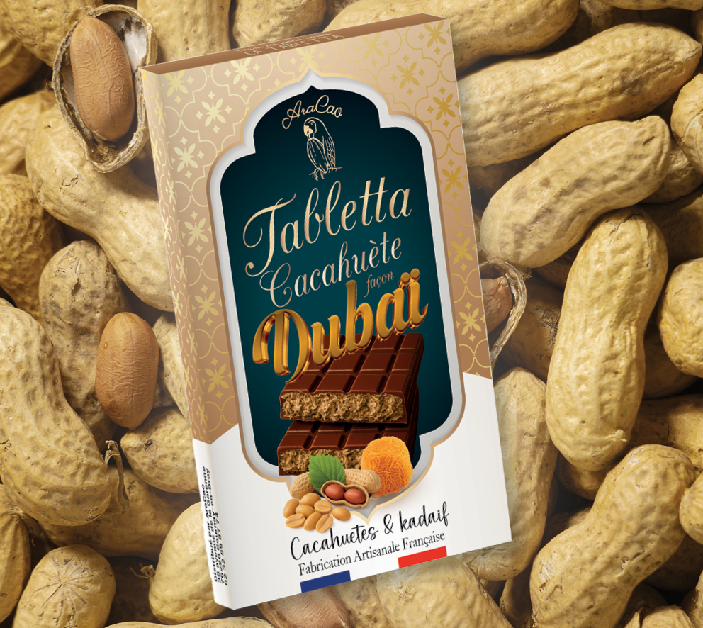 TABLETTA, c’est l’alliance d’un chocolat de caractère et d’un fourrage généreux façon “Dubaï” : une cassure nette, puis un fondant suave qui révèle les saveurs : Noisette, Cacahuète, Pistache, Fruits rouges….